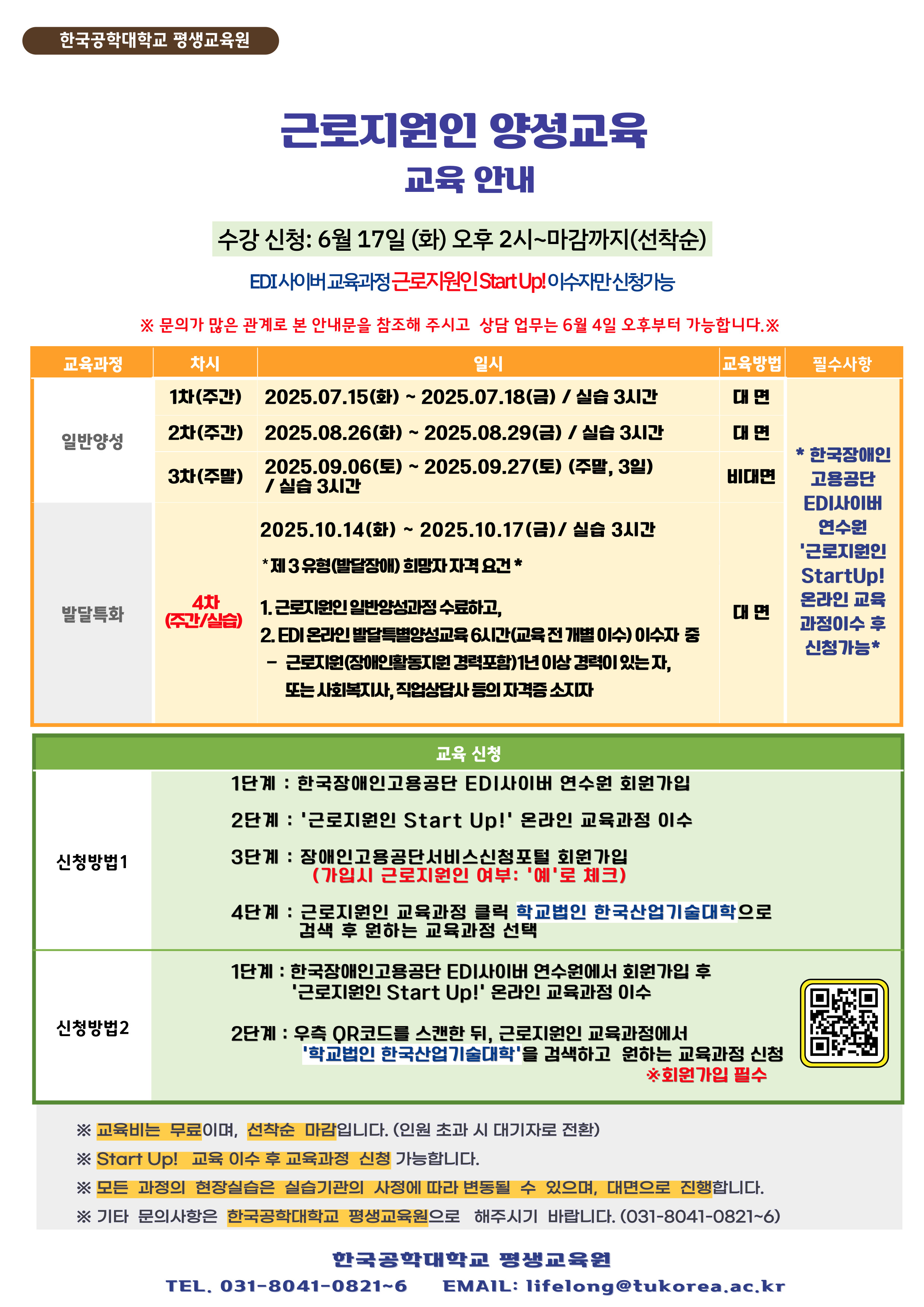 교육신청은 2025년 6월 17일(월) 오후 2시부터 장애인고용공단서비스신청포털에서 온라인 접수(선착순)받습니다.