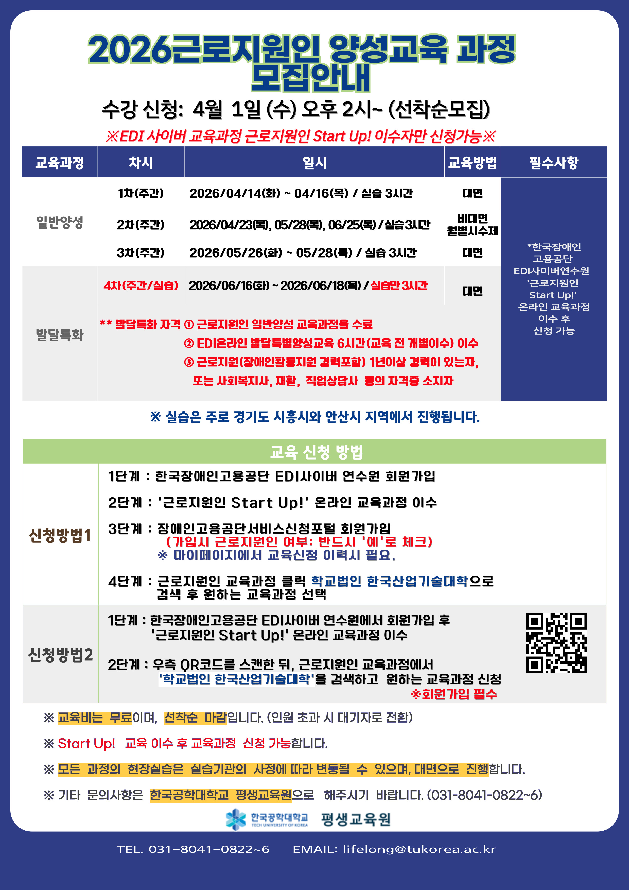 교육신청은 2026년 4월 1일(월) 오후 2시부터 장애인고용공단서비스신청포털에서 온라인 접수(선착순)받습니다.