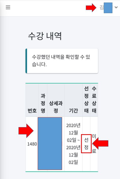 ※인정 가능한 증빙 자료 : MYPAGE의 수강내역 화면 캡쳐나 사진 (이름과 과정명, 선정상태가 보이는 것만 인정)